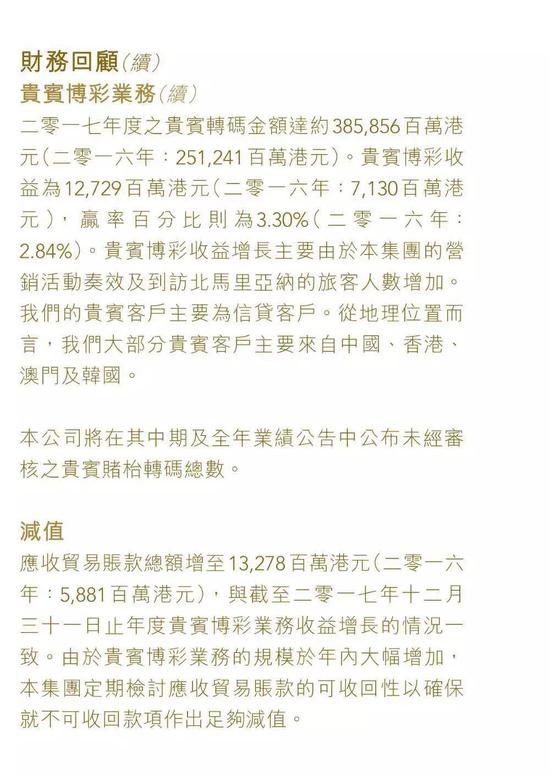 博华太平洋称,这些贵宾客户主要为“信贷客户”,即赌场为这些大多来自内地的豪客放贷,一般账期为30天,每名客户均设有最高贷款限额,新客户一般须先预付或提供若干证明。
