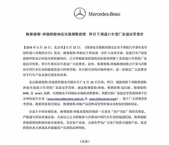 梅赛德斯-奔驰5月24日宣布,即日,根据新政下调梅赛德斯-奔驰全部进口车型的厂家建议零售价,涵盖梅赛德斯-奔驰、梅赛德斯-迈巴赫、梅赛德斯-AMG以及smart品牌,以期惠及不同细分市场的消费群体。调整后的厂家建议零售价即将于梅赛德斯-奔驰以及smart官方网站公布。此外,根据国家相关规定,梅赛德斯-奔驰产品的终端零售价格由各授权经销商制定。