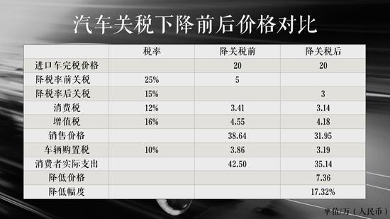 以一辆30万人民币2.0排量的进口车为例,原来的税率为25%,关税为7.5万元,消费税约为1.97万元,增值税约为6.31万元,总成本约为45.78万元。