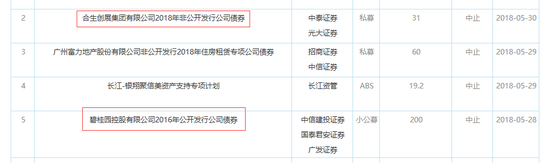 无独有偶,5月30日,合生创展2018年非公开发行公司债券遭“中止”,这笔债券拟发行额度为31亿元。