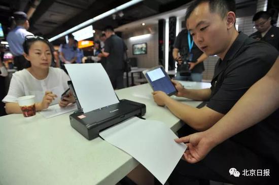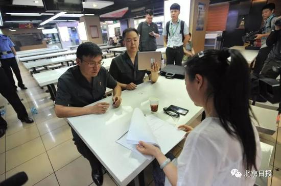 就在朝外华普超市的地下美食城,执行法官在对商户进行谈话时,手里拿着一部像平板电脑一样的电子设备,将谈话内容实时回传法院。