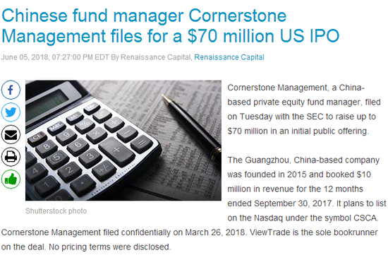 北京时间6月15日消息 据纳斯达克网站报道,中国知名私募基金管理人基岩资本(Cornerstone Capital)于近日向美国证券交易委员会(SEC)公开递交招股说明书(F1),计划登陆纳斯达克主板市场, IPO拟募集资金近5亿元,公司代码为“CSCA”。据悉,基岩资本IPO的基石投资者包括3家美国投行巨头及3家国内大型商业银行和券商。