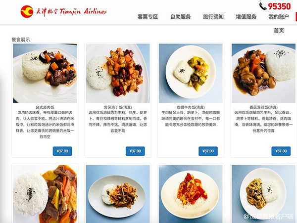 公告发出后,记者在天津航空官网上看到,已有“增值服务”一栏,点击进入便可自助订餐,相较于传统的飞机餐,天津航空提供的餐食展示更为丰富,包括台式卤肉饭、鱼香肉丝饭以及清真的咖喱牛肉饭和宫保鸡丁饭等8种餐食,其售价均为37元。