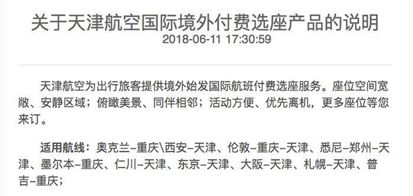 “我们将逐渐把您在飞行过程中可能增加您支出的部分服务变为选择项,让您享受更高性价比且更加灵活的定制服务”,6月7日,天津航空发布了关于取消部分国内航线免费餐食的公告,紧接着6月11日,天津航空又发布了关于国际境外付费选座产品的说明。专家认为,将机票和其他服务项进行拆分有助于航司在市场竞争中以更低的机票价格吸引消费者,同时也获得了辅助性收入的机会。