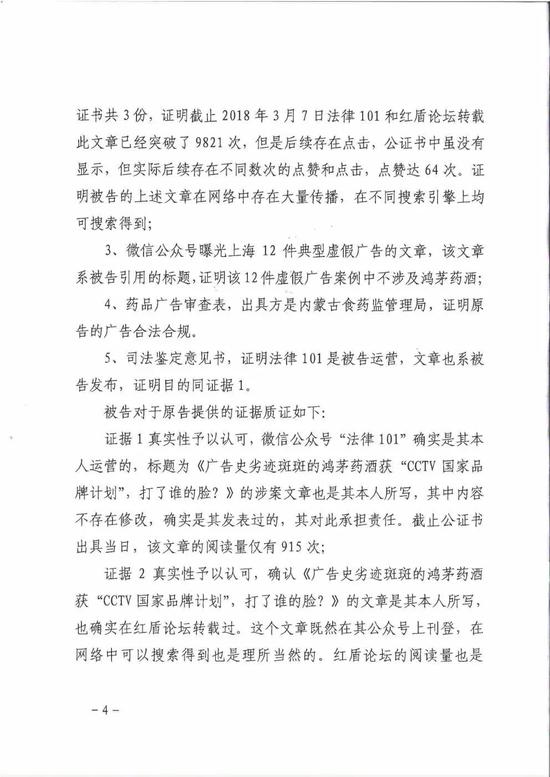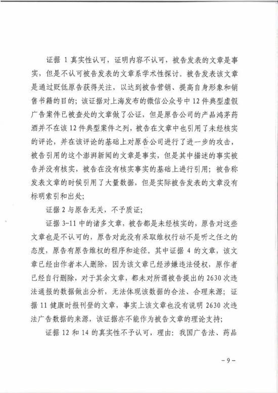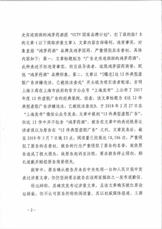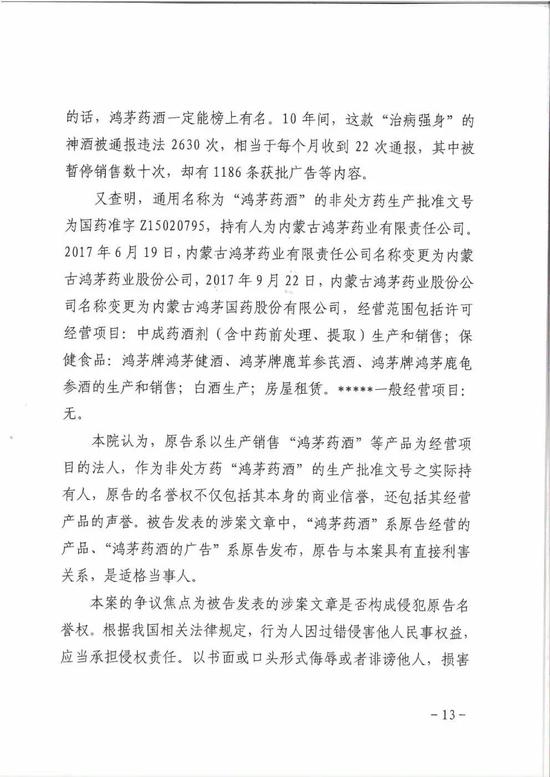 鸿茅药酒认为文章内容言辞锋利,违背事实,对象直指鸿茅药酒品牌及鸿茅国药,严重侵犯其名誉权。