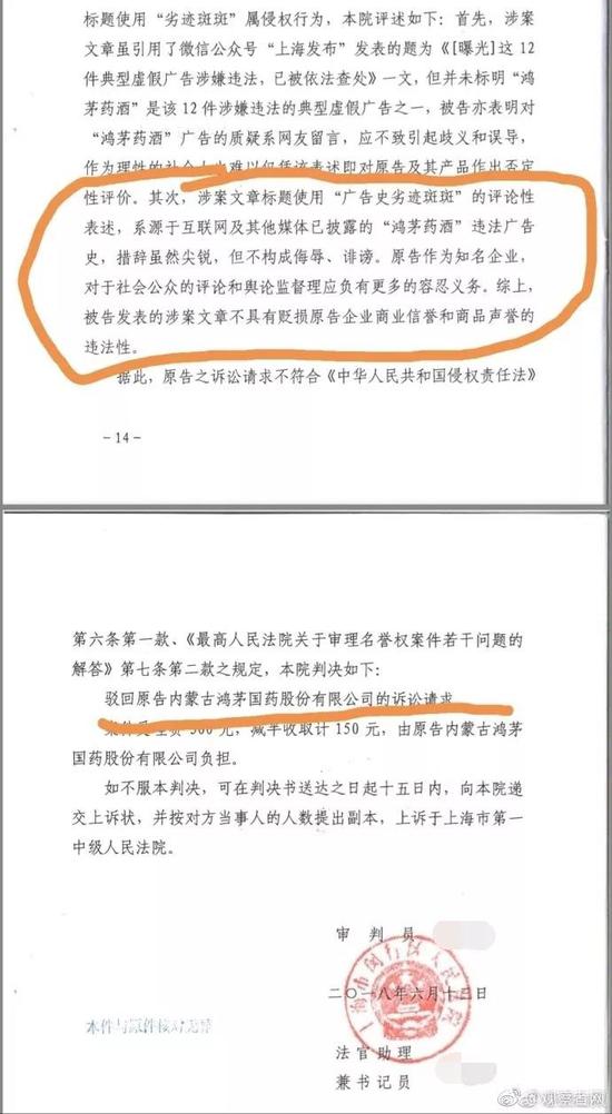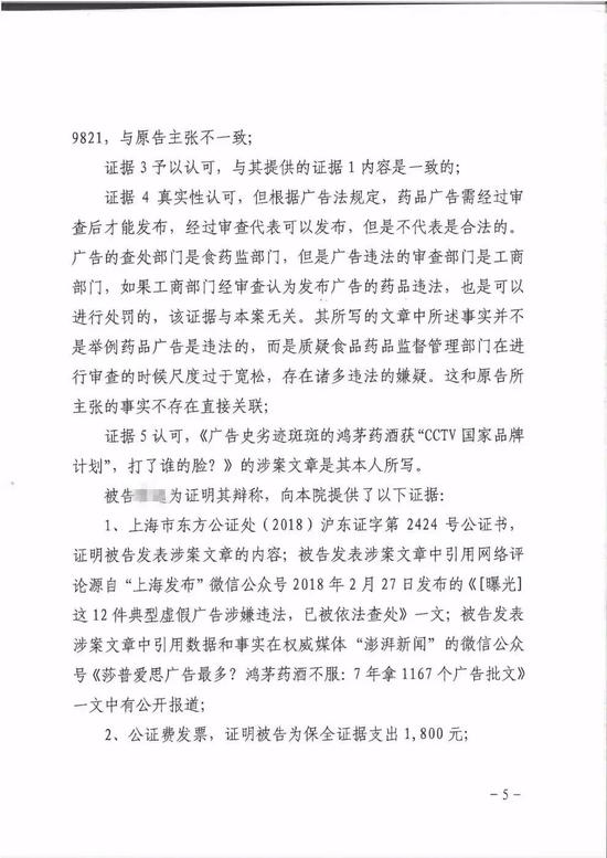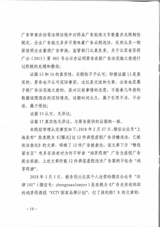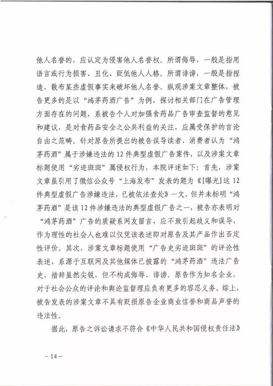 法院审理后认为,涉案文章虽引用了“上海发布”微信公众号的《这12件典型虚假广告涉嫌违法,已被依法查处》一文,但并未标明鸿茅药酒是该12件虚假广告之一,被告亦表明对鸿茅药酒广告的质疑系网友留言,应不致引起歧义和误导;其次涉案文章标题使用“广告史劣迹斑斑”的评论性表述,系源于互联网及其他媒体已披露的鸿茅药酒违法广告史,措辞虽尖锐,但不构成侮辱诽谤。原告作为知名企业,对于社会公众的评论和舆论监督理应负有更多的容忍义务。