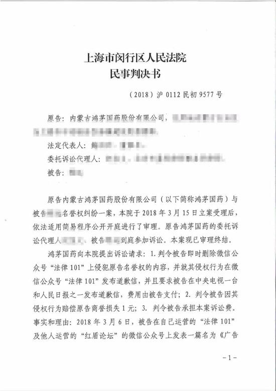 其后鸿茅药酒将其起诉,要求法院判令被告:公开道歉、赔偿商誉损失1元、承担案件诉讼费。