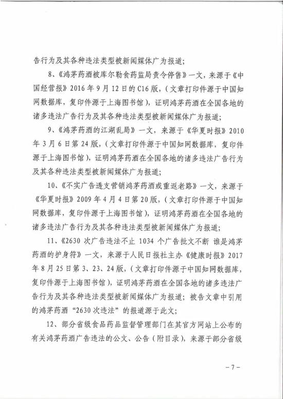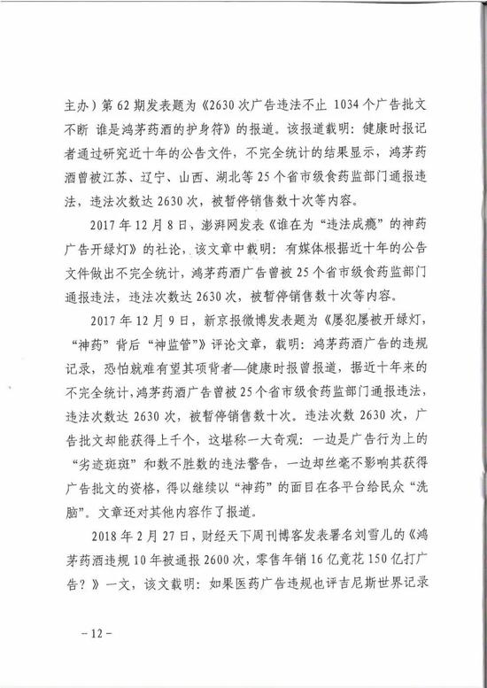 “此前,有媒体报道称,近10年间,这款‘治病强身’的神酒被通报违法2630次,2630次,笔者不敢肯定这一数据的准确性,但查阅互联网资料,鸿茅药酒有着劣迹斑斑的违法广告史是确凿无疑的。鸿茅药酒的违法广告行为有:虚假广告,表示功效、安全性的断言或者保证,违法使用代言人,未经审查发布广告,含有获奖等综合性评价内容,等等,并且层出不穷。”