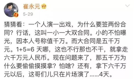 5月25日,崔永元微博发出一张千万元的合同截屏;5月28日,崔永元微博连发五张合同截屏,其中一张写有范冰冰的名字;5月29日,崔永元发微博,提到“阴阳合同”、“天价片酬”、“演了4天拿了六千万”等;6月2日,崔永元再曝“阴阳合同”。