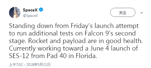 “从周五发起的尝试计划对猎鹰9号的二级进行更多测试,”该公司在推文中解释道。“火箭和有效载荷运行良好。目前计划6月4日在佛罗里达州Pad 40发射SES-12。”